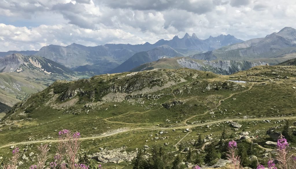 Als ik mezelf met de laatste pedaalslagen over de pashoogte sleur, stuur ik gelijk de parkeerplaats op waar je met typische Alpentaferelen wordt begroet. In de verte kan je op een heldere dag verschillende bergtoppen en gletsjers zien, zoals de Pic de la Grave, de Aiguilles d’Arves en de Pointe du Bouchet. Naar beneden kan je de weg richting het nabijgelegen Saint-Sorlin-d’Arves zien dalen.