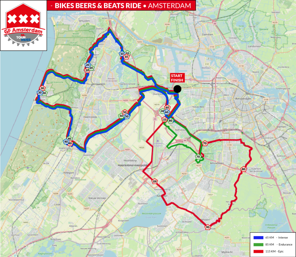 De route gaat namelijk via de polders bij Amstelveen richting Haarlem, waar je langs de kustlijn rijdt naar Zandvoort en via de duinen weer terugrijdt. Ook het Kopje van Bloemendaal zit in het parcours. Je kunt kiezen tussen de afstanden 65, 85 en 115 kilometer.