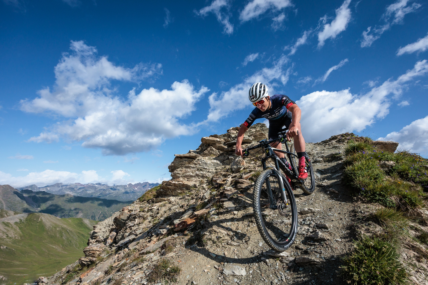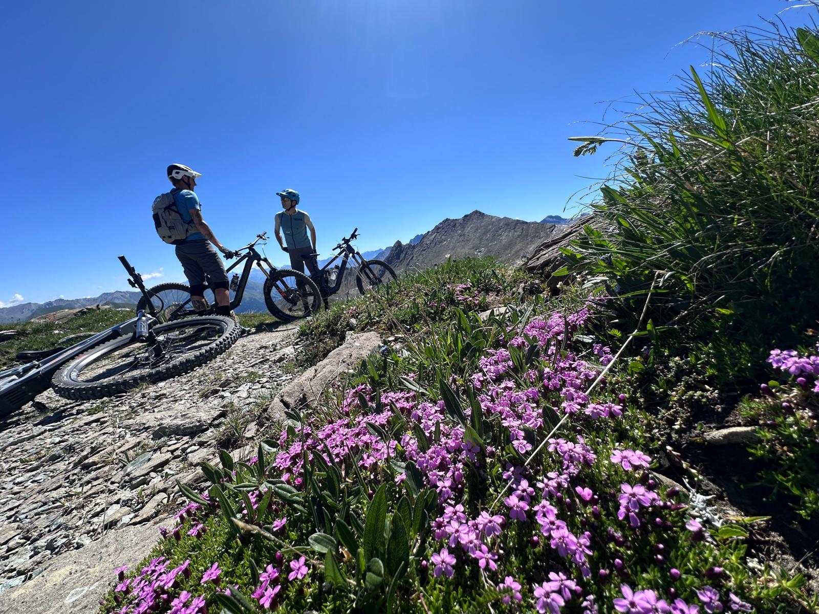 Op de Salaaser Kopf (2744m) genieten van het panorama-uitzicht en stoppen voor een paar foto’s. We verlaten Oostenrijk en gaan dalen af op Zwitsersgrondgebied over een trail die het woord ‘flow’ opnieuw definieert. Technisch in het begin, maar daarna puur genot om te rijden. De afwisseling tussen technische passages en weidse uitzichten zorgt ervoor dat je constant alert én verwonderd blijft.