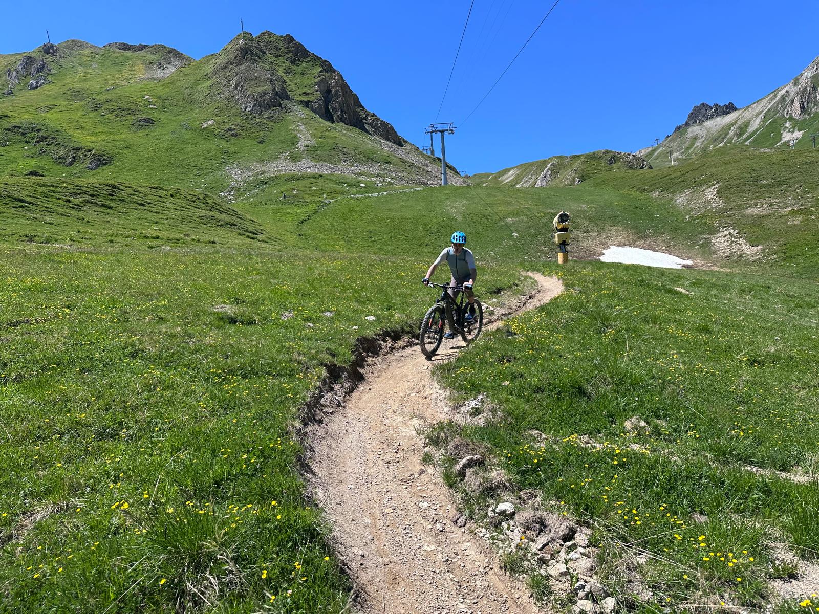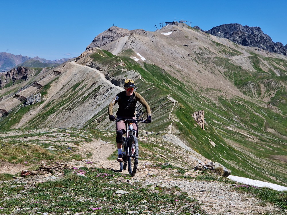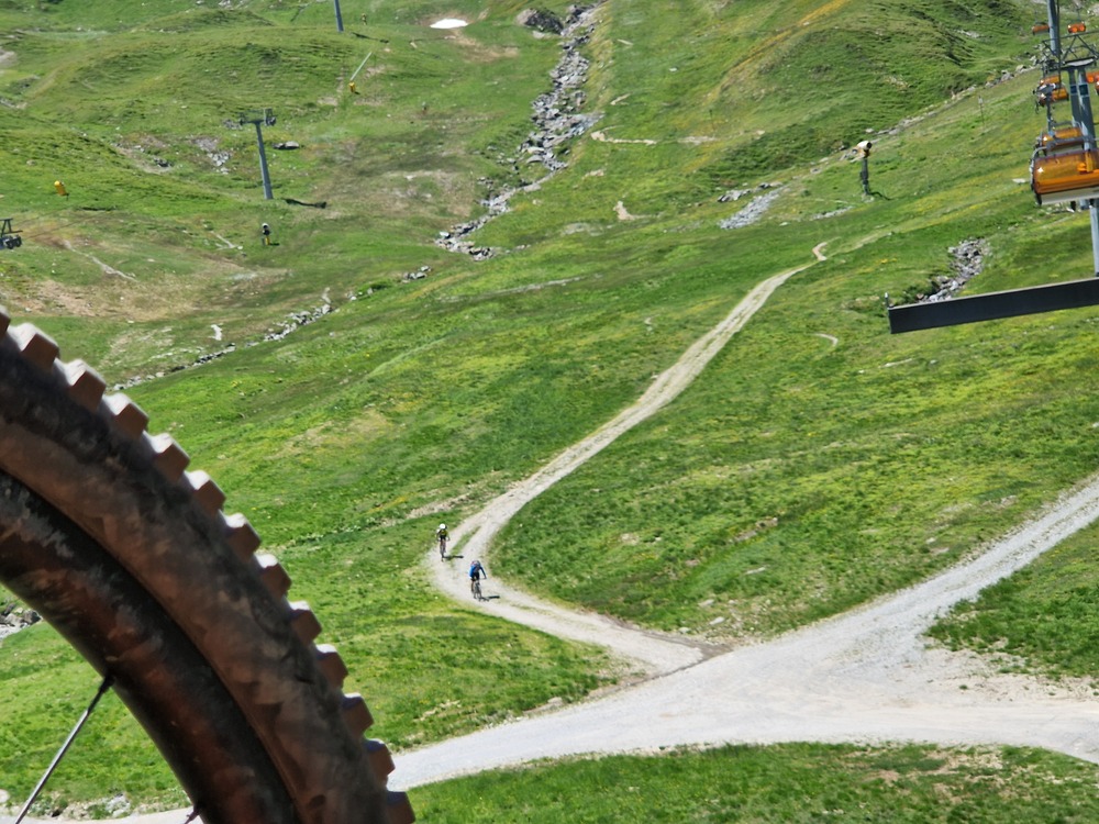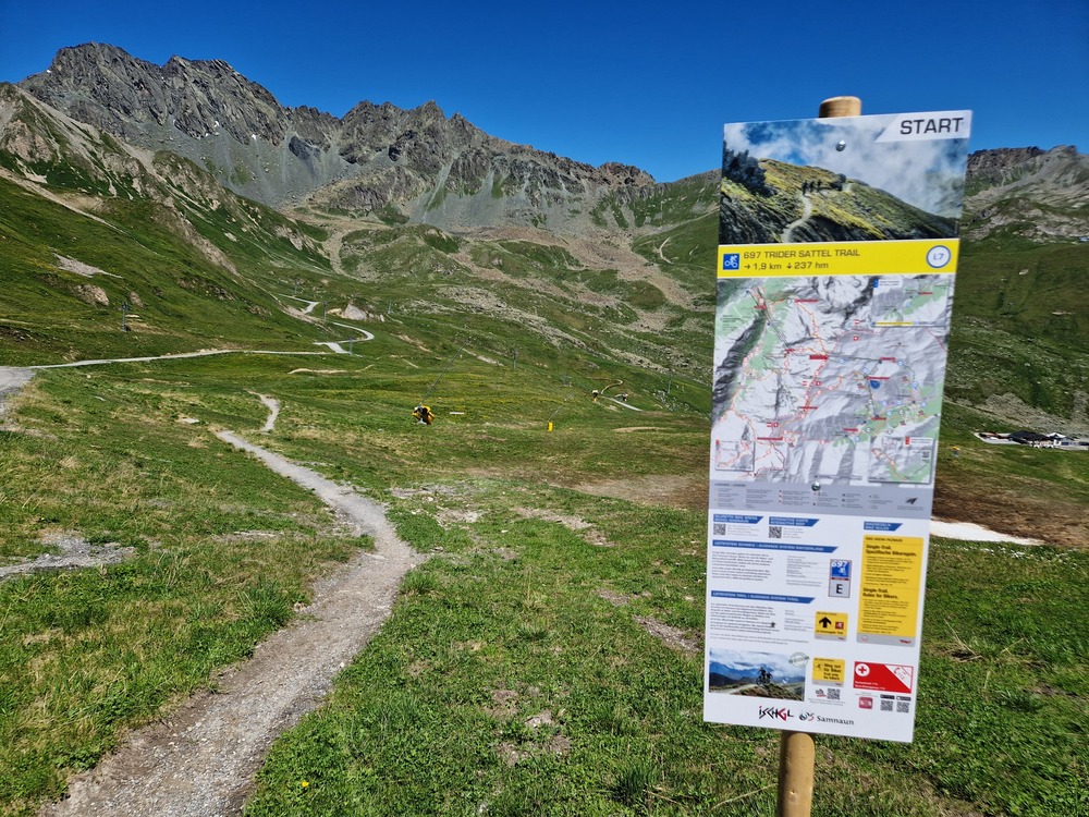 We passeren de Sattelbahn (2500m) en dalen af via een blauwe trail richting Alp Trida. Hier zien we al wat meer volk. Vanaf hier duiken we richting Samnaun, Zwitserland in. De afdaling via Compatsch is lang, kronkelend en vooral waanzinnig leuk. Waar in het begin hoogte en rotsen domineerden, zijn hier flow, groen en fun de kernwoorden.