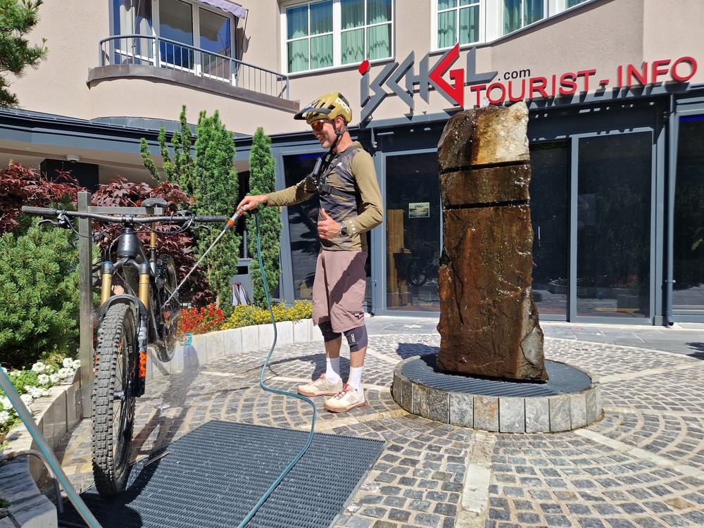 Terug beneden in Ischgl rollen we uit bij het VVV-kantoor, waar een afspuitplek is ingericht. Even het stof van de fiets spuiten, de remmen schoonmaken – en klaar. Mijn e-MTB krijgt zijn verdiende rust in de ondergrondse bike storage van hotel Ischglerhof. Een uitstekend hotel kortbij het dalstation van de Silvrettabahn waar we hartelijk ontvangen werden en kennis maken met de faciliteiten voor fietsers, van veilige bike storage tot bike cleaning.