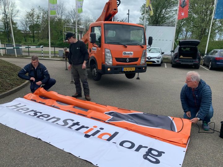 Ophangen spandoek HersenStrijd tijdens Amstel Gold Race.