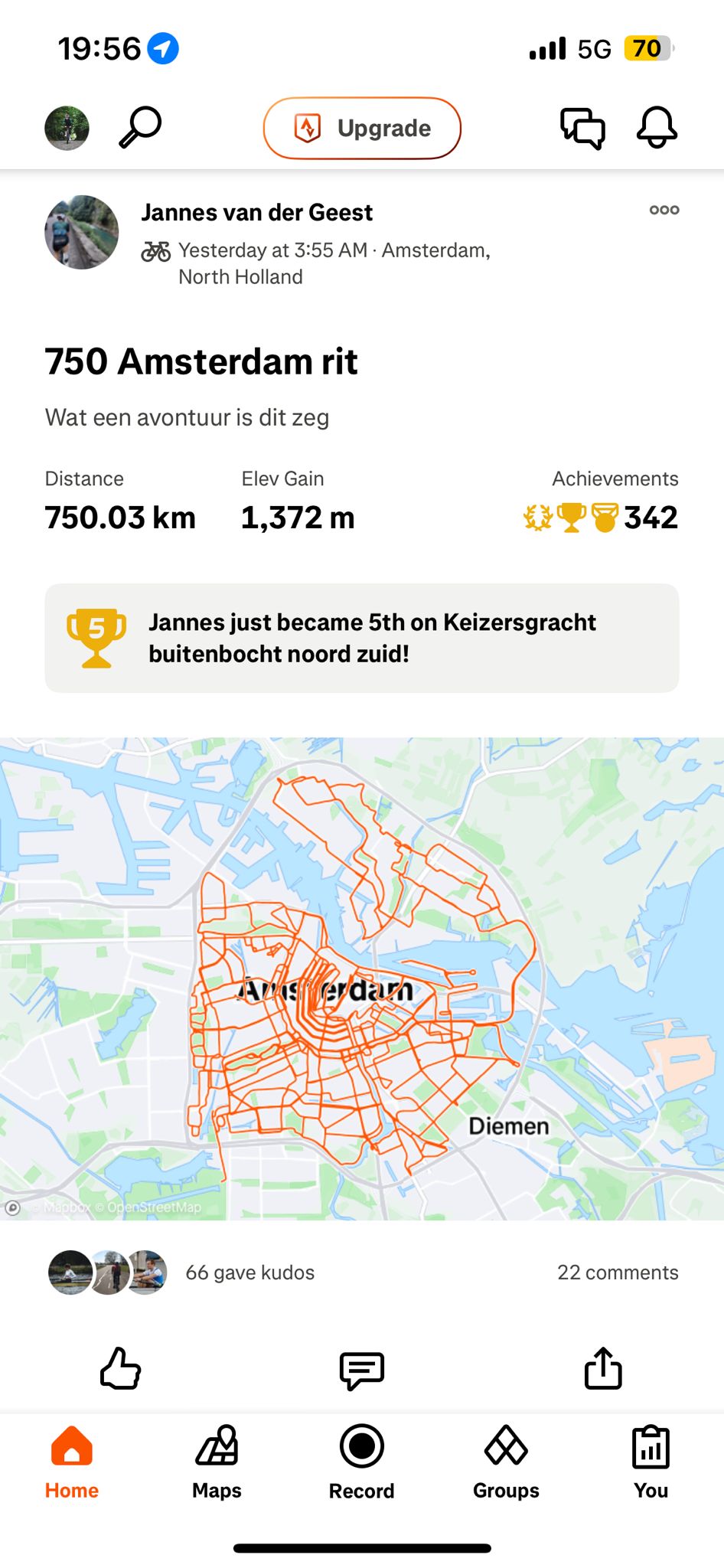 “Toen moest ik nog de overige 450 kilometer opvullen. Dat heb ik onder meer gedaan door 34 rondjes Vondelpark te maken, 10 keer over de fietssnelweg om het centrum heen te rijden en 2 keer de route van Amsterdam Noord te fietsen”, aldus de avonturier, die zijn tocht op Strava zette.