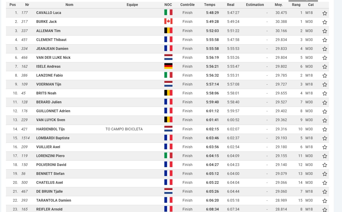 Cavallo kwam uiteindelijk als eerste boven op de Alp. Burke volgde een minuut later als tweede, terwijl de Belgische Gran Fondo-specialist Tim Alleman als derde over de streep kwam. Zowel Burke als Alleman zouden in de uiteindelijke uitslag echter nog een plaatsje zaken. De Fransman Thibaut Clement kwam namelijk weliswaar als vierde over de finish, maar hij behoorde tot een latere starttijd. Zijn netto tijd was daardoor wél beter dan die van Burke en Alleman – en die tijd telt.
