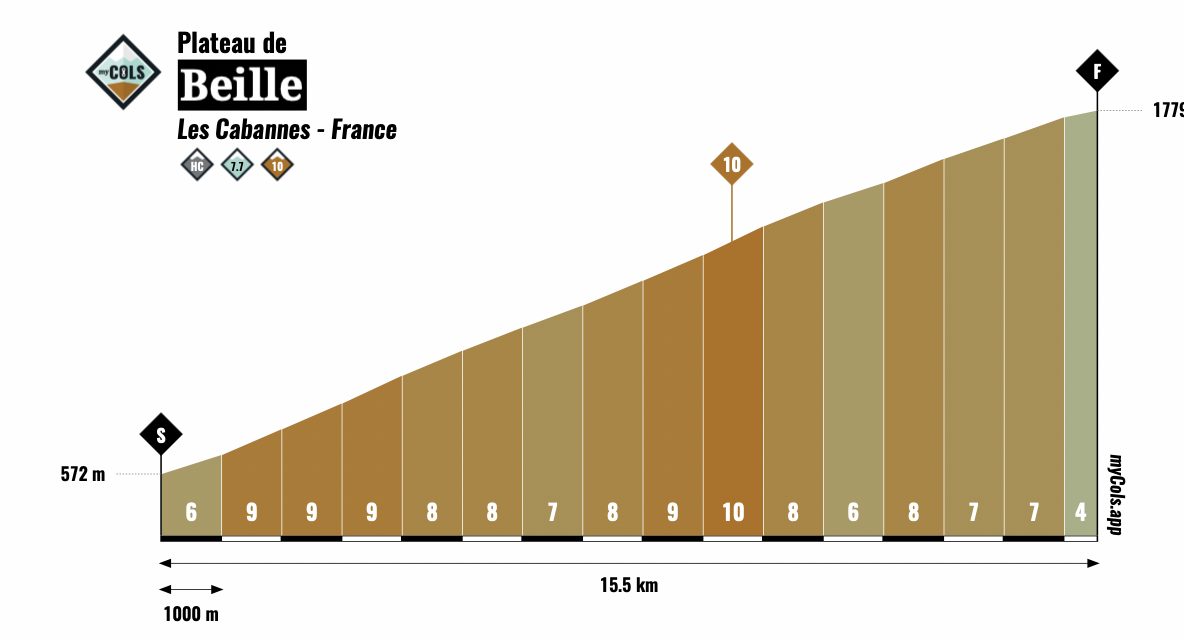 Over het algemeen is de klim vrij regelmatig. De eerste kilometer en de laatste zijn het makkelijkst, met stijgingspercentages van zes en vier procent. Daartussen komt de klim nauwelijks onder de acht procent. Na tien kilometer is het Plateau de Beille op zijn zwaarst, als een kilometer lang het stijgingspercentage tien procent is.