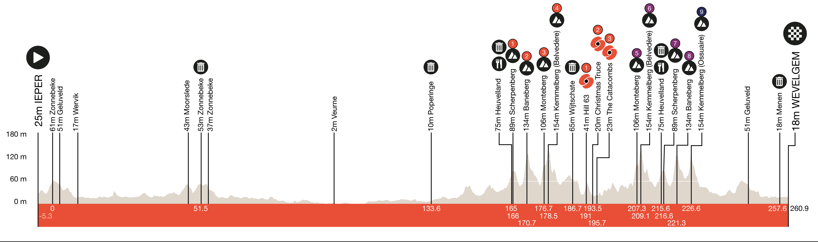 De opvolgers van Biniam Girmay en Elisa Balsamo zoeken we tussen Ieper en Wevelgem. De winnaars moeten de Moeren doorstaan en in het heuvelland over de Monteberg, de Baneberg, de Scherpenberg en de Kemmelberg. De plugstreets zijn eveneens een vaste waarde in de koers. Eerst finishen de mannen (rond 17.00 uur) en daarna de vrouwen (rond 18.15 uur).