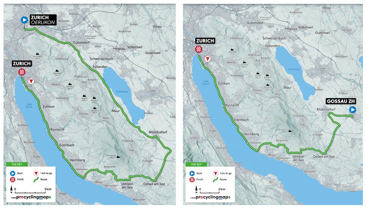 De mannen en de vrouwen krijgen enkele korte klimmetjes voorgeschoteld in de tijdrit: eerst een van 2,6 kilometer aan gemiddeld 4,5% en daarna een kuitenbijter van 1,4 kilometer aan ruim 5%. Daarna is het nog ruim 15 kilometer naar de finish in Zürich. Deze verlopen grotendeels over rechte en vlakke wegen langs de oevers van het Meer van Zürich.