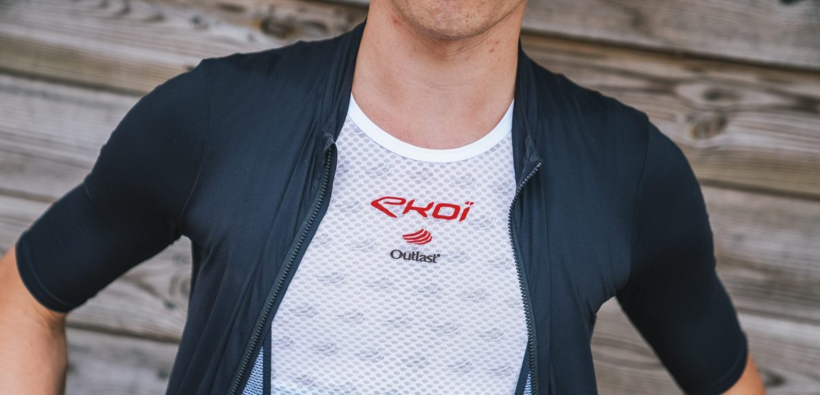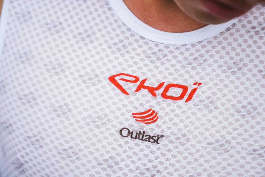 Het paradepaardje van Ekoï – als we het hebben over ondershirts – is het Outlast Proactif ondershirt. “Dit shirt biedt de beste thermoregulatie”, vertelt Stéphane. “In deze stof zit een soort wax verwerkt welke vloeibaar wordt als hij warm wordt, terwijl hij in vaste staat verkeerd als het koud is. Effectief zorgt dat ervoor dat het shirt bij hitte helpt om je lichaam af te koelen en in de kou juist helpt om warmte vast te houden. Hierdoor blijft je lichaam meer op een constante temperatuur wat niet alleen fijn is, maar ook je prestatie ten goede komt.”