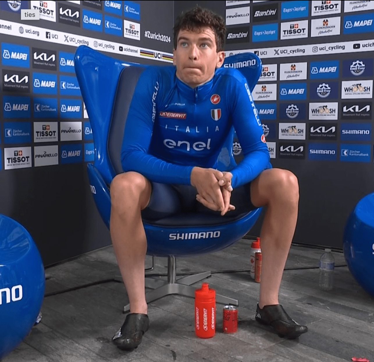 Materiaalzone Op het Europees kampioenschap tijdrijden was Edoardo Affini primus en ook tijdens het WK tijdrijden wist hij beslag te leggen op een medaille: hij rolde als nummer drie over de streep. Daarbij maakte de Italiaanse coureur gebruik van een opvallend paar schoenen.