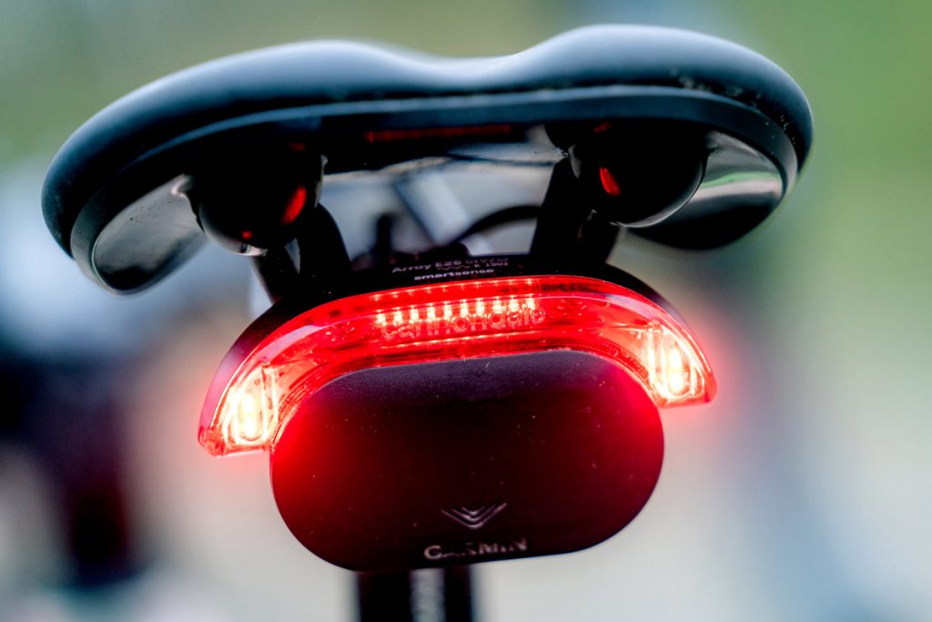 Deze Smartsense is uitgerust met een voor- en achterlicht van Lezyne. Vooraan straalt het 350 lumens uit, achteraan 25 lumens. Prima om overdag en in het donker beter zichtbaar te zijn, maar voor ’s nachts rijden zijn sterkere lampen aan te raden.