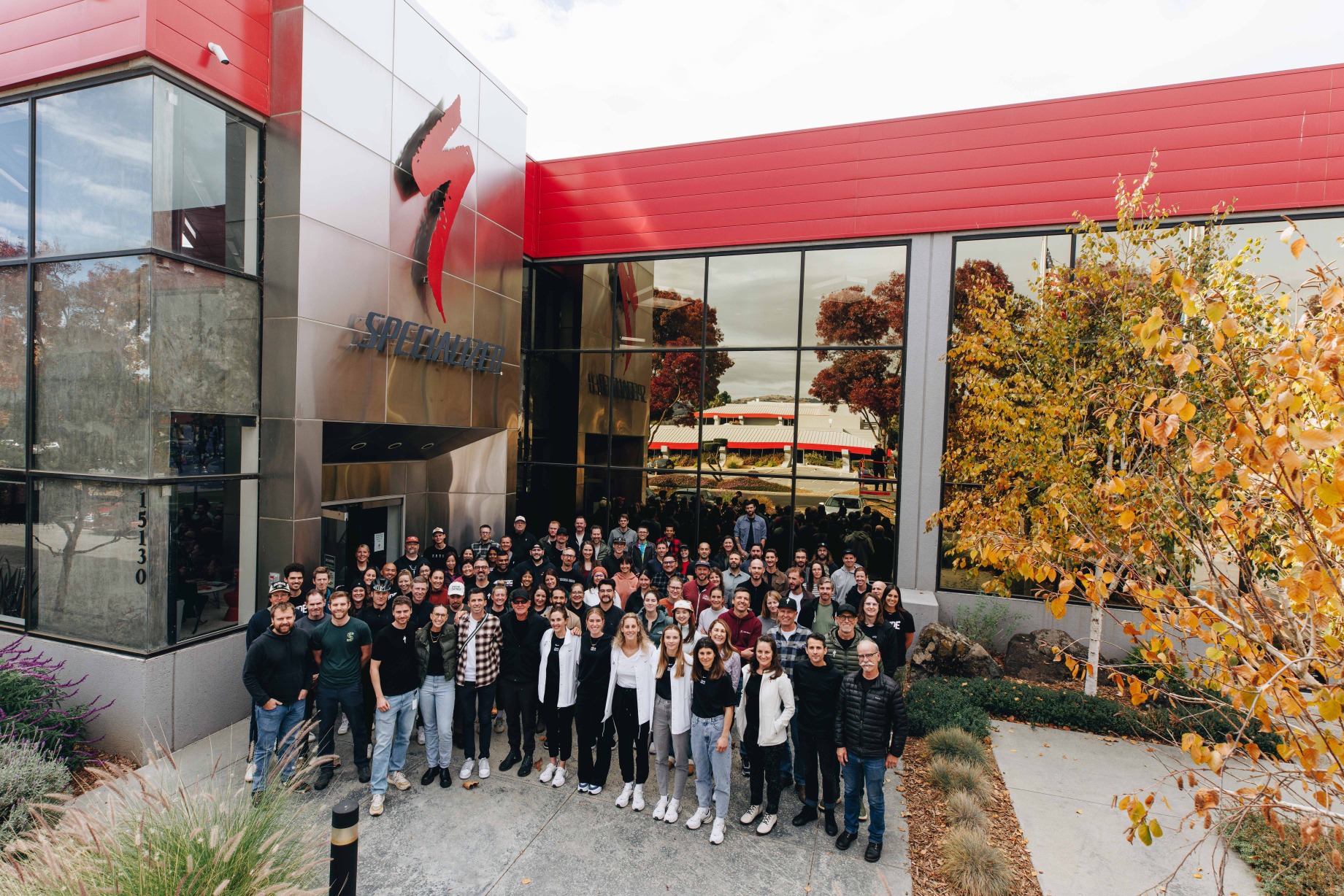 Vollering en co voor de gebouwen van Specialized – foto: Cor Vos