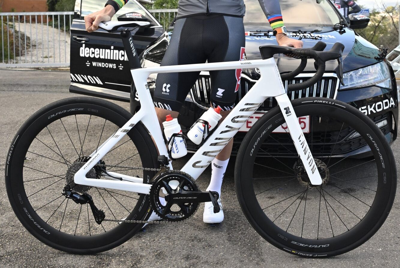 Net als de voorbije jaren trekt MVDP naar de koers op zijn geliefde Canyon Aeroad. Daarop zijn qua materiaal weinig veranderingen ten opzichte van afgelopen jaar. Eén nieuwe sponsor maakte zijn entree bij Alpecin-Deceuninck: bandenmerk Pirelli levert voortaan het rubber in plaats van Vittoria.Afgelopen jaar zagen we Mathieu van der Poel op maar liefst zes verschillende designs rijden, maar dit jaar start hij ‘gewoon’ op de fiets waarop hij afgelopen seizoen afsloot. Dat is een volledig witte Aeroad, met daarop zilveren bestickering. Er valt één wijziging op te merken aan dat ontwerp: in het zwart is het logo van Pirelli toegevoegd op de staande achtervork.