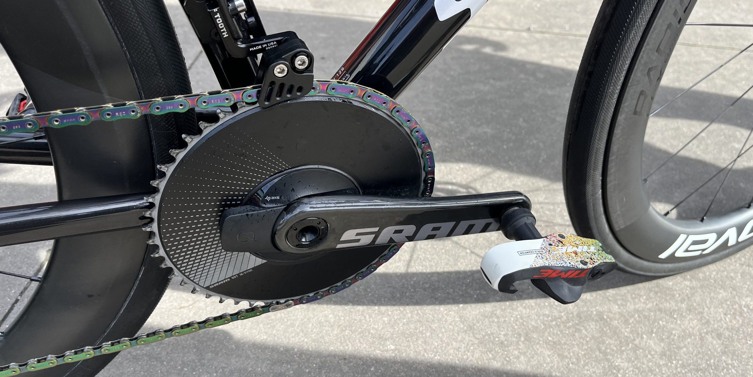 Ook op wegfietsen zien we steeds vaker 1-by, zoals op Lotte Kopecky’s fiets voor Parijs-Roubaix, met een chain guide – foto: Ties Wijntjes