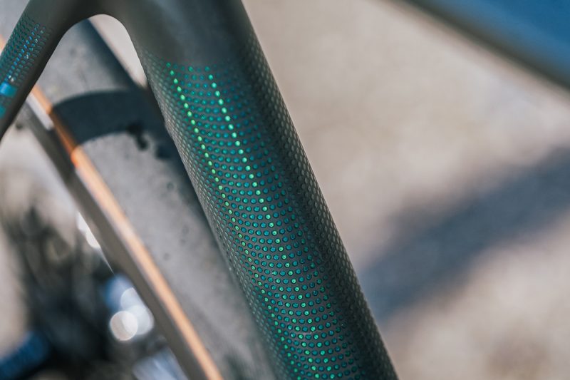 De kleur van dit model valt het beste te omschrijven als donkergrijs met een (licht glanzende) donkergroene kleur voor de letters en de logo’s. Op de voorvork, zadelbuis en achtervork zijn er een reeks stippen aangebracht. Stijlvol, al dient het niet direct een aerodynamisch doel.