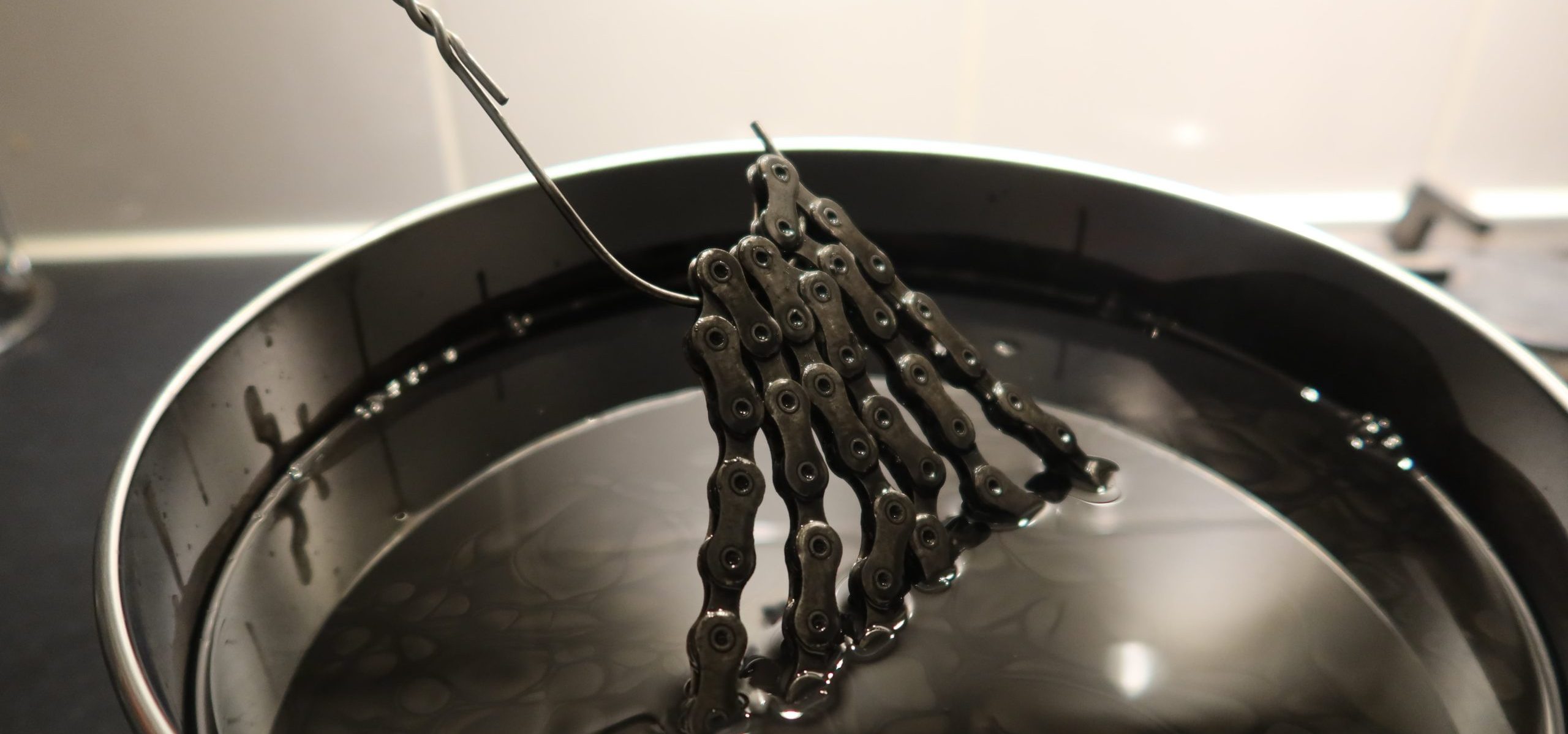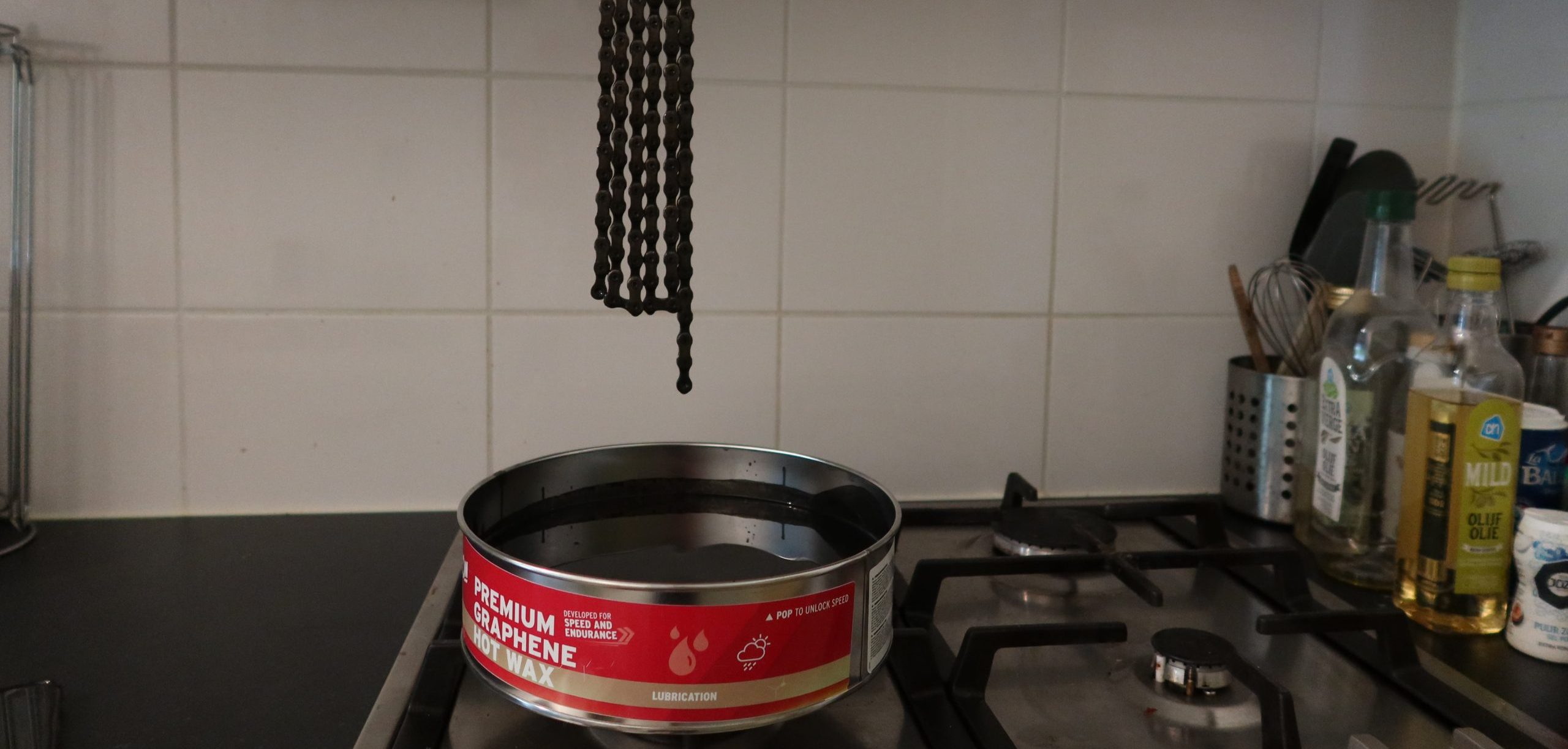 Met het blik op het vuur, is het tijd om je ketting los te halen van je fiets. Nadat alle wax is gesmolten leg je de ketting tien minuten in de wax, die je ondertussen op laag vuur laat staan. Na tien minuten haal je de ketting uit het bad en laat je deze drogen aan de lucht. Dat is een klein knelpunt, want daarvoor heeft CyclOn niks meegeleverd. Met een kledinghanger van metaaldraad is dat makkelijk op te lossen, al kan je met een los stukje metaaldraad ook makkelijk iets knutselen.