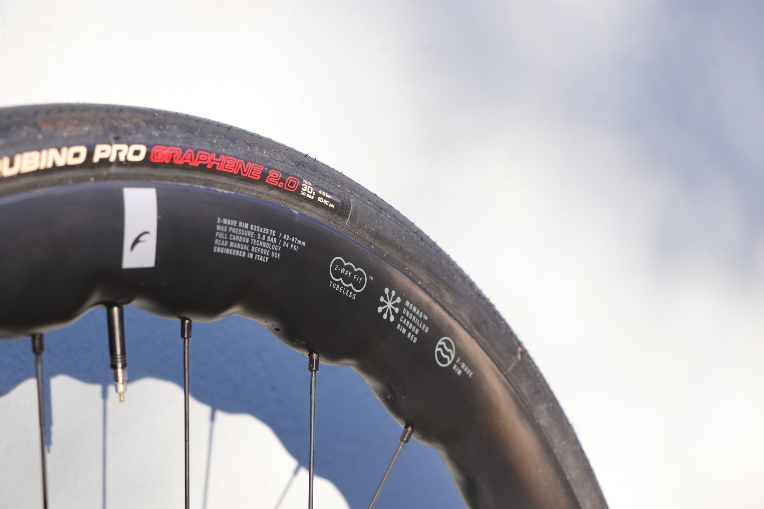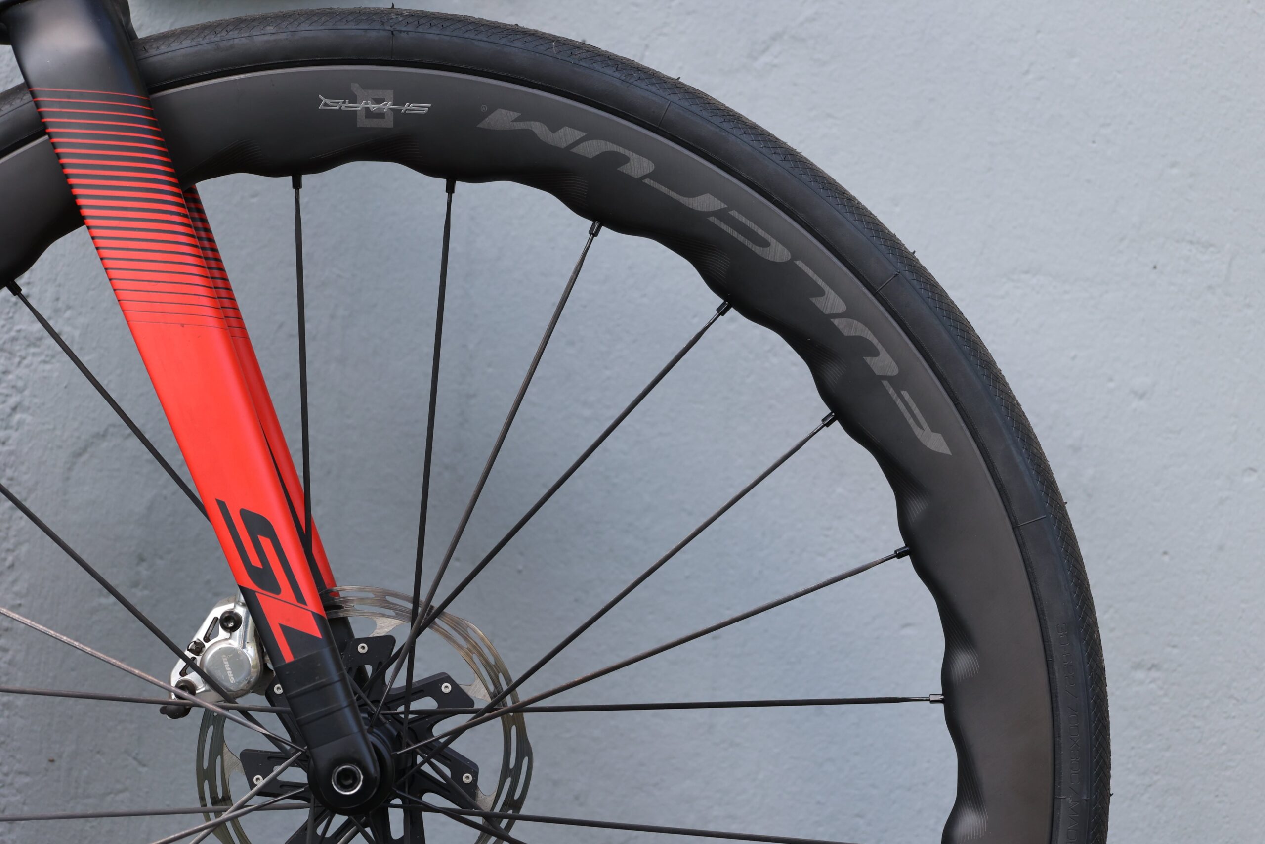 Te beginnen dus met dat opvallende velgprofiel, wat Fulcrum het 2-Wave Rim-profiel noemt: een golvend velgontwerp dat de velgdiepte laat variëren van circa 42 millimeter tot 47 millimeter. Dat zou zorgen voor aerodynamische kwaliteiten, maar zorgt er eveneens voor dat de wielen niet te vatbaar zijn voor zijwind en draagt zo bij aan stabiliteit. De Fulcrum Sharq is er ook nog in een variant met een diepere velg, die varieert van 57 tot 62 millimeter in diepte.