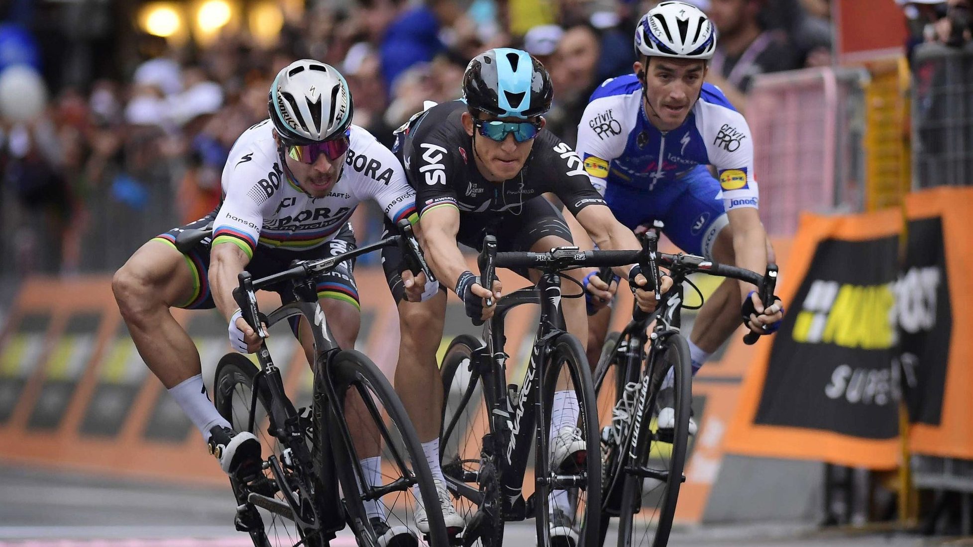 In de koers die het kledingstuk zijn naam geeft, Milaan-San Remo, is het een millimeterspurt tussen Julian Alaphilippe, Michal Kwiatkowski en Peter Sagan die de winnaar bepaalt. Het is Kwiatkowski die uiteindelijk met een banddikte voorsprong de zege grijpt, in… exact, het Sanremo Speed Suit.