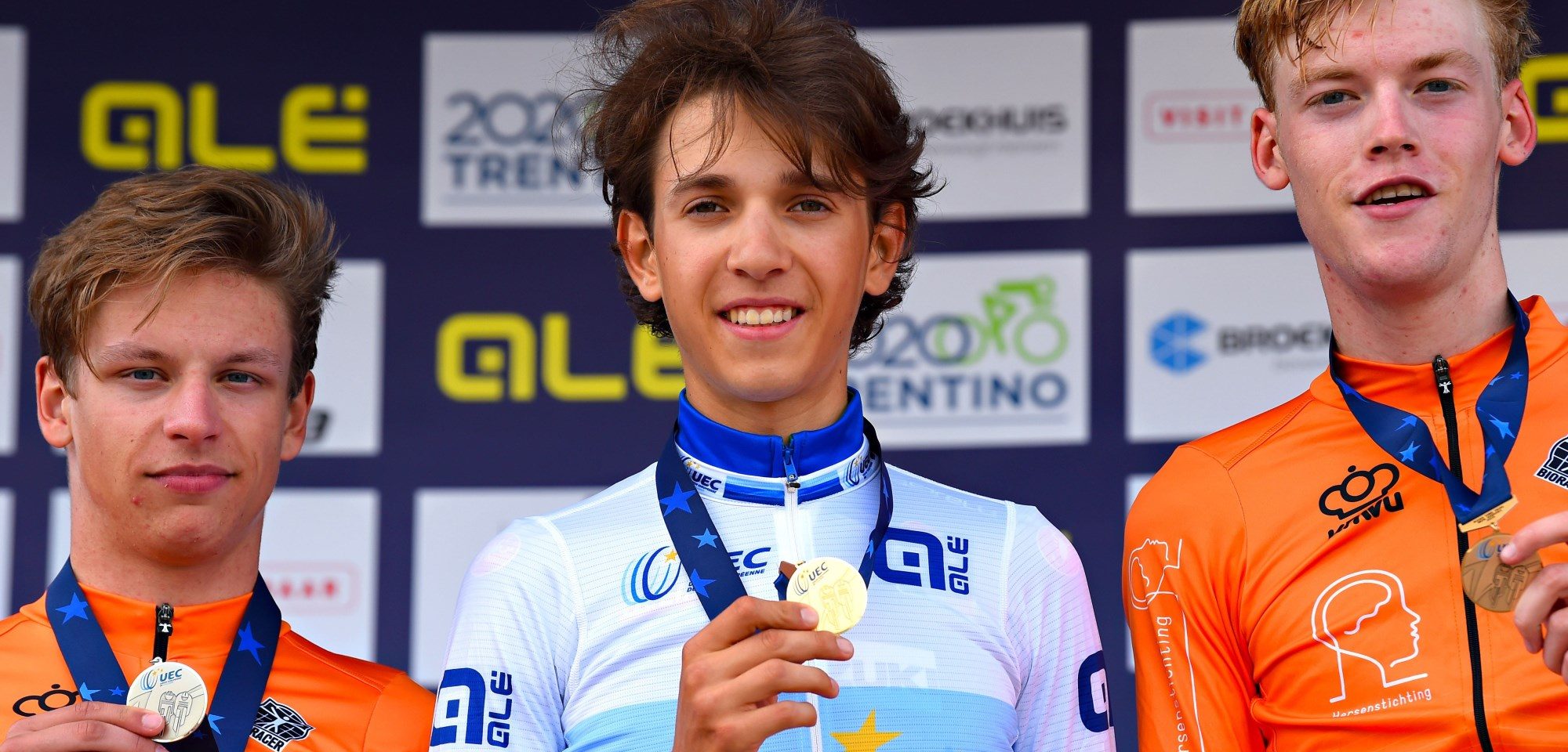 Piccolo won in 2019 het U23-EK tijdrijden, vóór Lars Boven en Enzo Leijnse – foto: Cor Vos