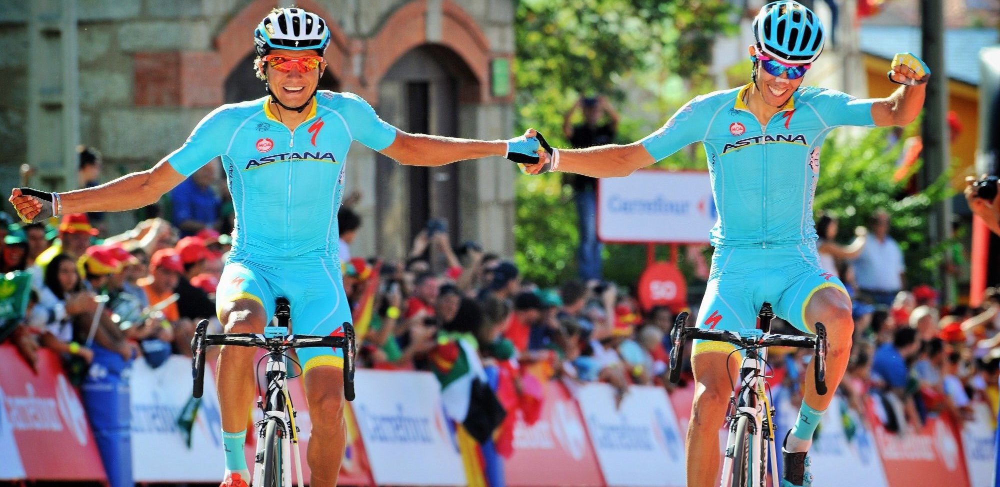 Zeits (links) viert in 2015 samen met Diego Rosa de Vuelta-zege van Fabio Aru – foto: Cor Vos
