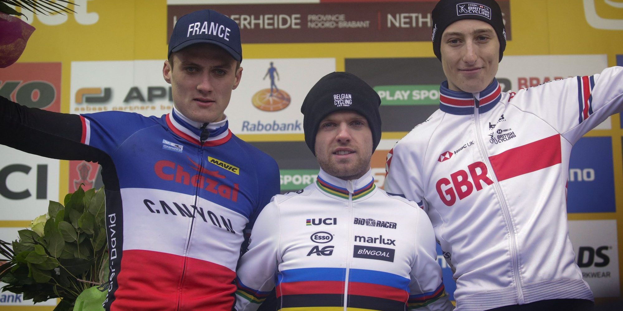 Benoist (links) met Eli Iserbyt en Ben Turner op het podium van de WB van Hoogerheide U23, 2019 – foto: Cor Vos