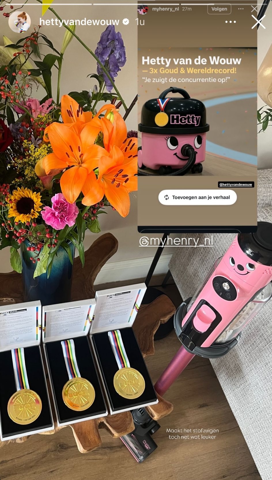 In een bericht op social media grapte het Henry-account over de prestaties van Van de Wouw op het WK: “Drie keer goud en wereldrecord. Je zuigt de concurrentie op!” Daar was een foto bij geplaatst van een knalroze stofzuiger met niet de naam Henry, maar met ‘Hetty’ erop.