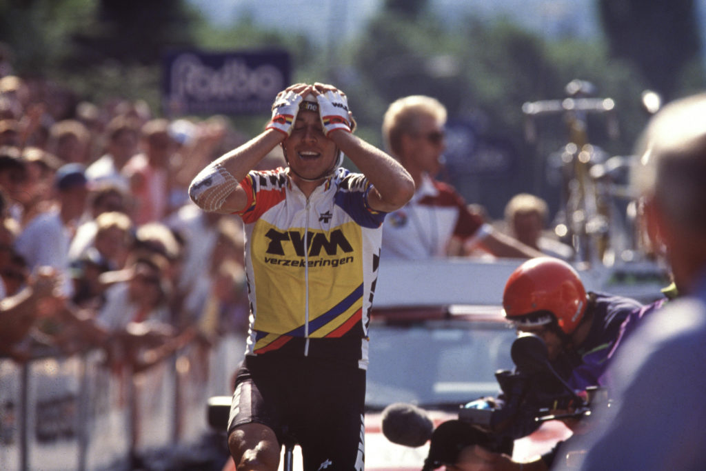 Nederlands kampioen worden als neoprof. Tristan Hoffman deed het in 1992. Net prof bij TVM-Sanyo reed de destijds 22-jarige coureur na een lange solo in Meerssen naar de overwinning. Hoffman’s ploeggenoot Jan Siemons mocht na afloop met de nieuwe Nederlands kampioen mee het podium op, evenals Erik Breukink. Het zou voor de beloftevolle Hoffman, die datzelfde jaar ook nog eens twee etappes won in de Tour de l’Avenir, bij deze ene driekleur in zijn carrière blijven. Al was de uit de Achterhoek afkomstige Hoffman er in 1998 nog eens dichtbij, toen hij achter Michael Boogerd tweede werd.