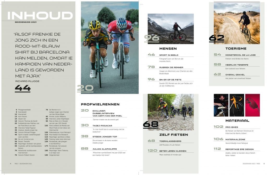 In ons eerste nummer lees je onder meer een dubbel-interview met Mathieu van der Poel en Wout van Aert, interessante gesprekken met Tourwinnaar Tadej Pogacar en wereldkampioen Julian Alaphilippe, columns van Thomas De Gendt en Richard Plugge, een bezoek aan de mannen van Tour de Tietema, een reportage over de fietsavonturen van Robert Gesink, verhalen over de fameuze Col de la Loze en fietsen op Tenerife en nog veel meer mooie verhalen over de wielersport. De volledige inhoudsopgave presenteren we hieronder.