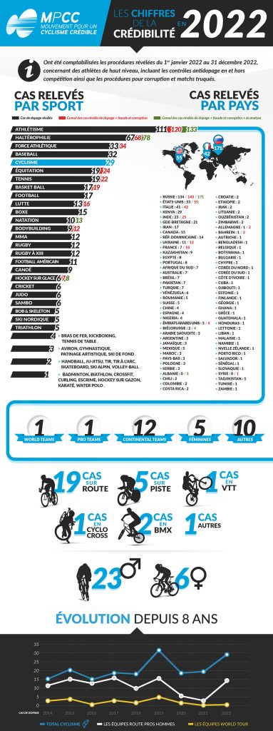 Het wielrennen telde in 2022 ook 29 gevallen. Hier waren wielrenners uit 15 verschillende landen voor verantwoordelijk. Voor beide geslachten en disciplines is dit de op één na slechtste score in acht jaar (na 2019). Bij een nadere analyse van de MPCC gegevens blijkt echter dat bij de professionele wielrenners (WorldTour-ploegen en ProTeams) dit eigenlijk het laagste aantal (twee gevallen) is dat ooit is geregistreerd sinds de Festina-affaire in de ‘Tour du Dopage’ in 1998.