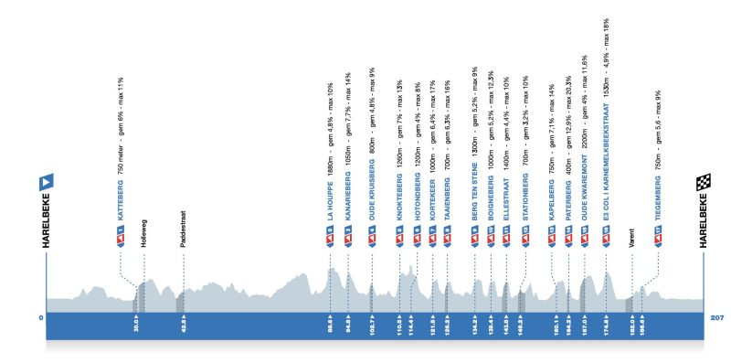 Opletten is het vanaf La Houppe, in de provincie Henegouwen, op 117 kilometer van de streep. Vanaf daar begint een nerveuze fase waarin de renners quasi elke tien kilometer een kuitenbijter voor de wielen geschoven krijgen. De Kanarieberg, Oude Kruisberg, Knokteberg, Hotondberg en Kortekeer zijn de eerste hellingen waarop de koers kan losbarsten.