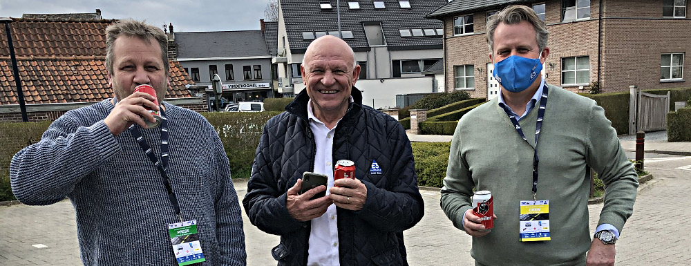 Na een korte stoppauze, komen we aan bij de Boigneberg. De wind waait hevig, de ordehandhavers doen hun best om fietstoeristen die er halt houden, de nodige afstand te laten bewaren. En Coussens vertelt ons waarom hij absoluut naar deze helling wilde. “De volledige helling is ter gelegenheid van deze editie een eerbetoon aan Michel Wuyts… Michel heeft veel gedaan voor de E3 Saxo Bank Classic. Zoals vele journalisten trouwens. Dat schat ik naar waarde, want je hebt de media nodig als kanaal om uw product te verkopen. Dat besef is bij ons heel groot.”