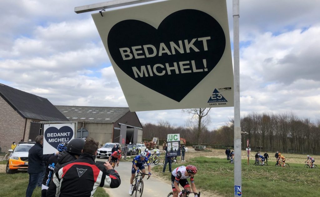 “Maar Michel wordt 65. Ik weet niet of hij nog aan de slag blijft, maar het zou zomaar eens zijn laatste E3 kunnen worden als verslaggever. Dat wilde ik niet zomaar laten voorbijgaan.” Op de klim hangen meerdere borden met het opschrift ‘Bedankt Michel’. Al hoop ik, om misverstanden te vermijden, dat hij ook de komende jaren nog aan de slag blijft bij VRT.”