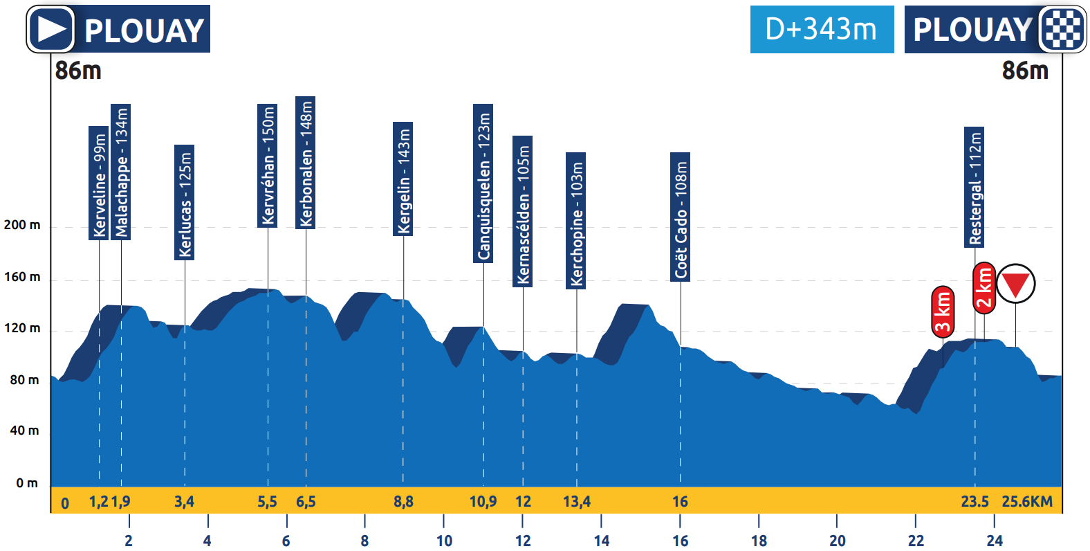 Renners en rensters van alle categorieën worden over hetzelfde parcours gestuurd: een 25,6 glooiende expeditie tussen Plouay en Kernascélden. Voor de junioren-vrouwen is dit een opmerkelijke afstand, daar de UCI-reglemeten een tijdrit van maximaal vijftien kilometer voorschrijven. Ze zullen niet gelijk doodgaan van een tien kilometer lange rit tegen het uurwerk, maar het zal voor hen ongetwijfeld wel even aanpassen zijn. De afstand zal de absolute toppers van het elitepeloton niet direct angst inboezemen, maar een nadere bestudering van het parcours kan geen kwaad.