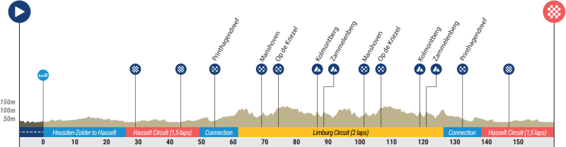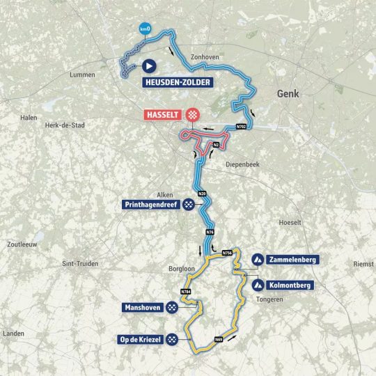 Na dik 25 kilometer draaien de rensters voor het eerst het lokale circuit van Hasselt op. Na twee finishpassages trekt de karavaan richting de heuvelzone. Of ja, heuvelzone, het rondje met de twee hellingen die de renster voor de kiezen krijgen. Veel stellen de Kolmontberg en de Zammelenberg niet voor, maar in combinatie met de kasseienstroken op het rondje tussen Borgloon en Tongeren liggen er echt wel wat mogelijkheden om er een interessante koers van te maken.