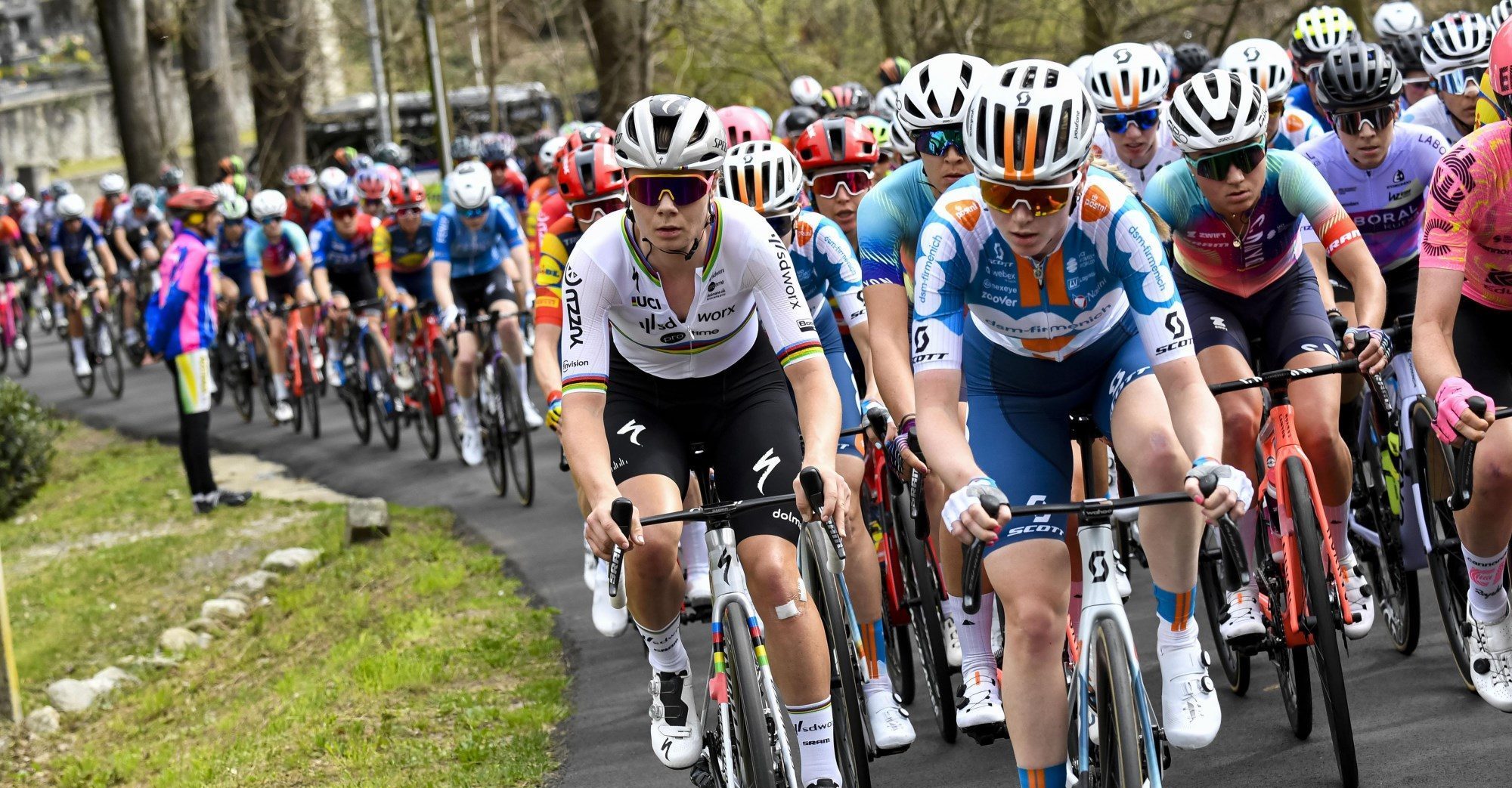 Lotte Kopecky was in haar regenboogtrui de grote blikvanger – foto: Cor Vos