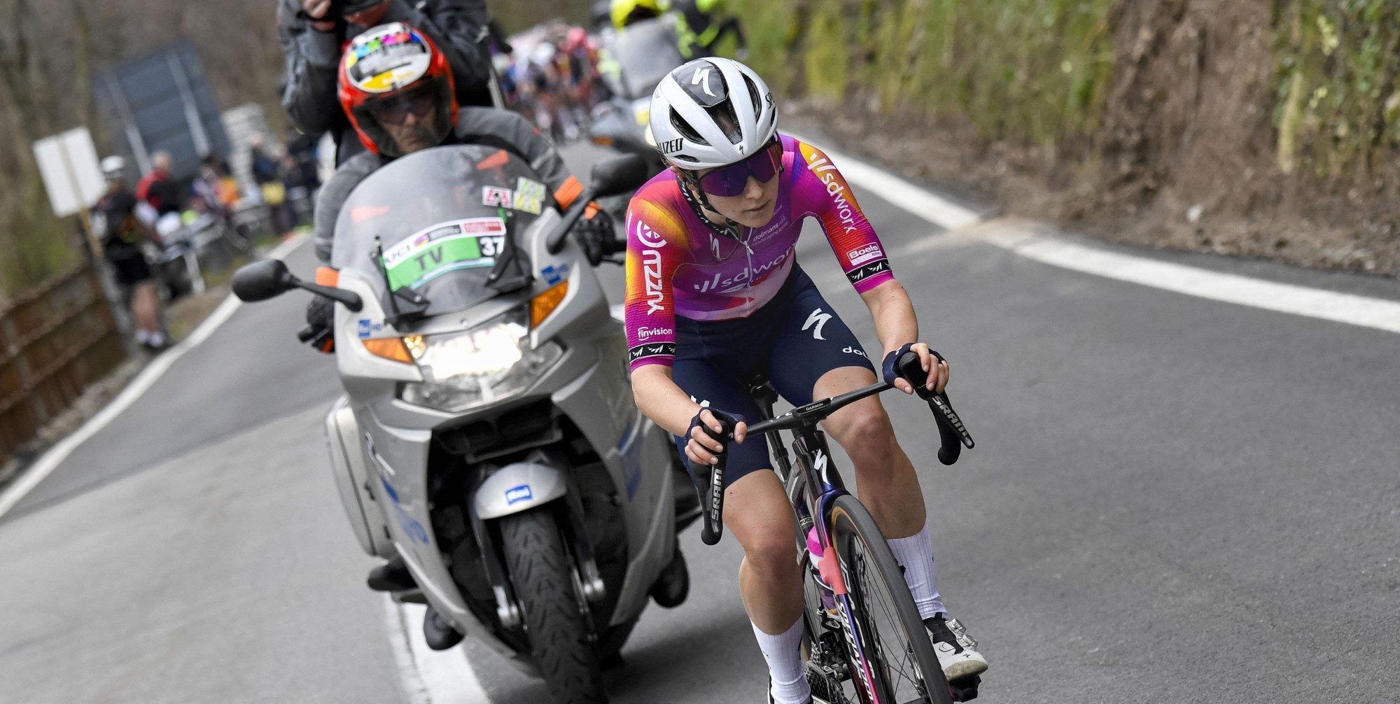 Niamh Fisher-Black wist op de beklimming naar Orino in een ruk naar Pieterse te rijden. De Nieuw-Zeelandse van SD Worx-Protime nam ook meteen over, maar het verschil op een inmiddels flink uitgedund peloton was te verwaarlozen. Fisher-Black en Pieterse werden in de afdaling van de beklimming dan ook weer in de kraag gevat. Dit was voor Marlen Reusser het sein om te demarreren, maar de Zwitserse tijdrijdster raakte niet weg.