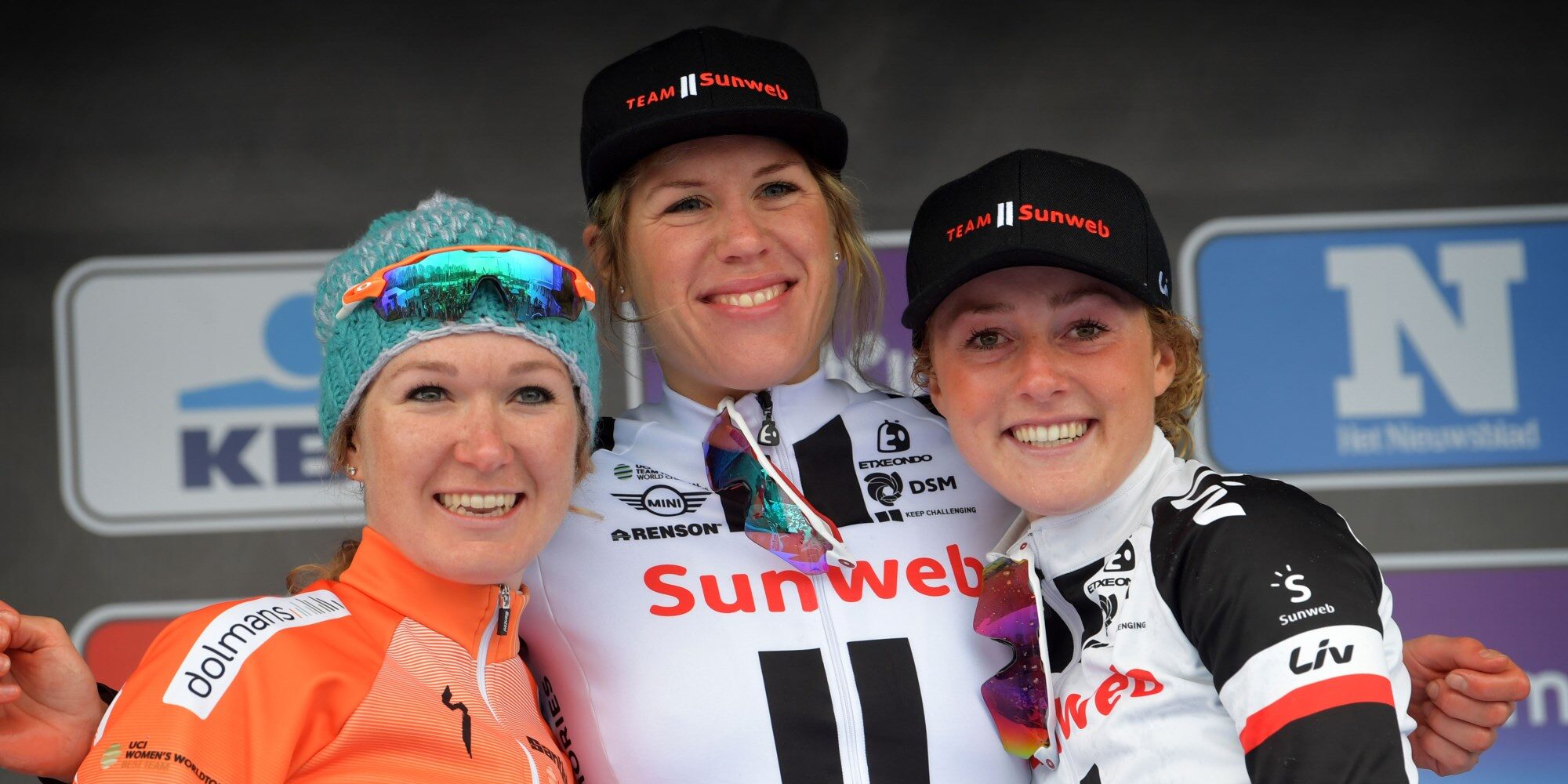 Pieters na haar ongeluk, met Van der Breggen en Majerus – foto: SD Worx-Protime