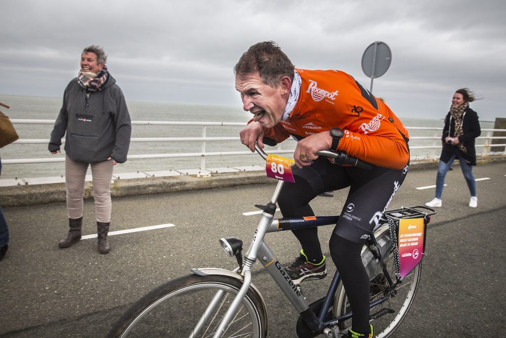 Een ander mats-gedeelte is De Tegenwind-mee bocht. Je rijdt er een rondje, waardoor je 50 meter heel even de wind in de rug hebt. Maar daarna krijg je ‘em weer vol op je bakkes. Wat wel kan bijdragen: het aerodynamische ventieldopje die je krijgt voor de start. Maar dat is nog niet alles. Er is dit jaar ook een Smokkelfinish. Die ligt anderhalve meter dichterbij dan normaal, een dikke knipoog naar de anderhalvemeter-maatschappij van de laatste twee jaar.
