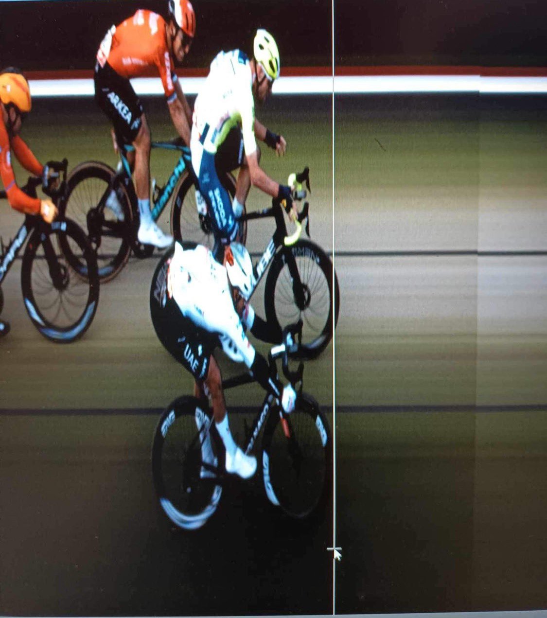 Het UCI-reglement schrijft voor dat als het met het blote oog niet zichtbaar is, dat dan de finishfoto leidend is.