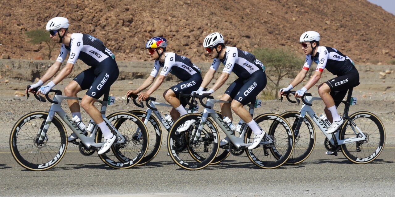 Frison met Pidcock in zijn wiel tijdens de AlUla Tour – foto: Cor Vos