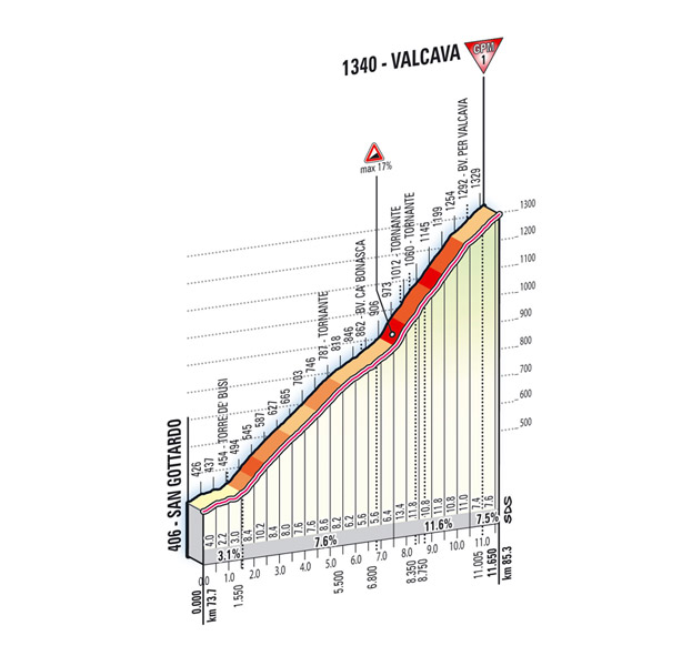 De eerste beklimming is de zwaarste, de Valico de Valcava, en van eerste categorie. Deze beklimming is 11.6 kilometer lang met een gemiddeld stijgingspercentage van 8,1 procent, met een piek tot zeventien procent. Na een lange afdaling volgt een heuveltje dat niet geklasseerd is gevolgd door de Forcella di Bura van derde categorie.