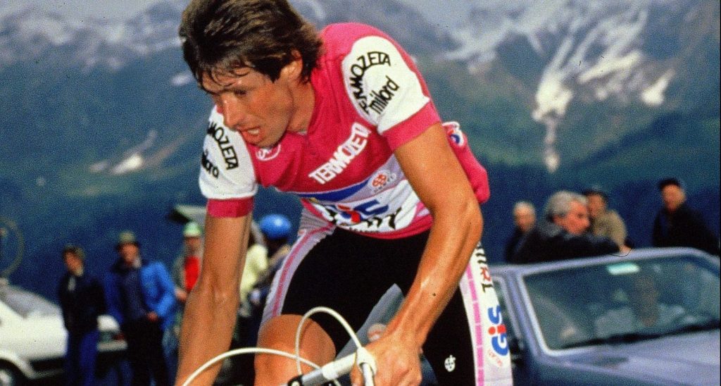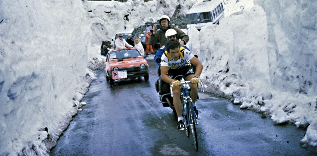 Bernard Hinault tussen de sneeuwwanden van de Passo dello Stelvio, 1980 – foto: Cor Vos