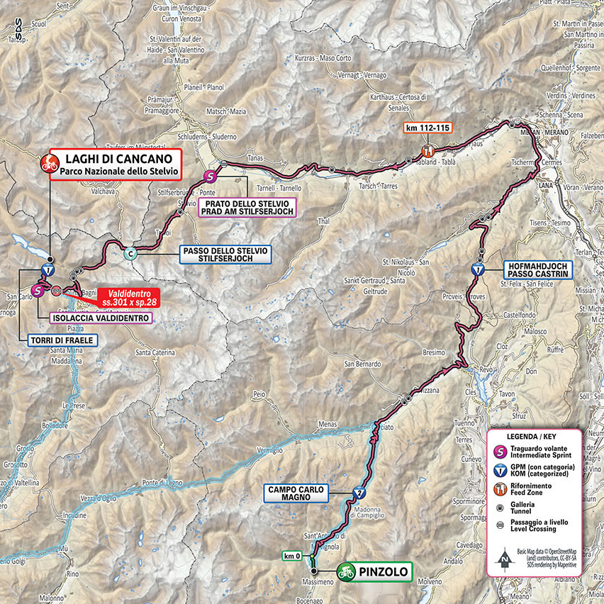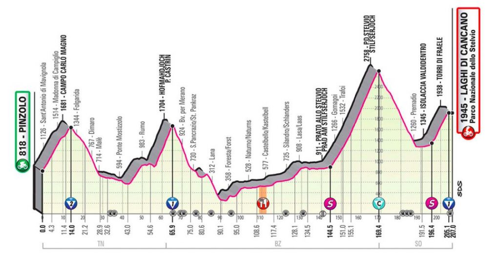 De koers zal hier waarschijnlijk in een eerste plooi vallen, aangezien de renners nu bijna zestig licht oplopende kilometers krijgen voorgeschoteld richting de voet van de Passo dello Stelvio. Op de flanken van deze mythische col zullen de maskers definitief afvallen, worden klassementsambities opgeborgen en zullen grote verschillen ontstaan. De Stelvio wordt vanuit Prato aangevat en is 24,7 kilometer lang aan 7,5%.