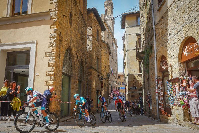Zo was alles nog bij elkaar, toen de renners na goed zeventig kilometer de voet bereikten van de eerste beklimming van de dag. Nou ja, Tim van Dijke had 22 meter voorsprong op de meute toen hij begon aan de Volterra (9,8 km aan 4,2%). Op de eerste steile stroken werd de Nederlander weer ingerekend, waarna de betere klimmers erin vlogen. We zagen onder meer Gijs Leemreize doortrekken. Hij wist zich echter niet af te scheiden, in tegenstelling tot Filippo Fiorelli, Aurélien Paret-Peintre en opnieuw Alaphilippe. Zij sloegen een behoorlijk groot gat. Hadden we met nog honderd kilometer te gaan eindelijk een ‘vroege’ vlucht?