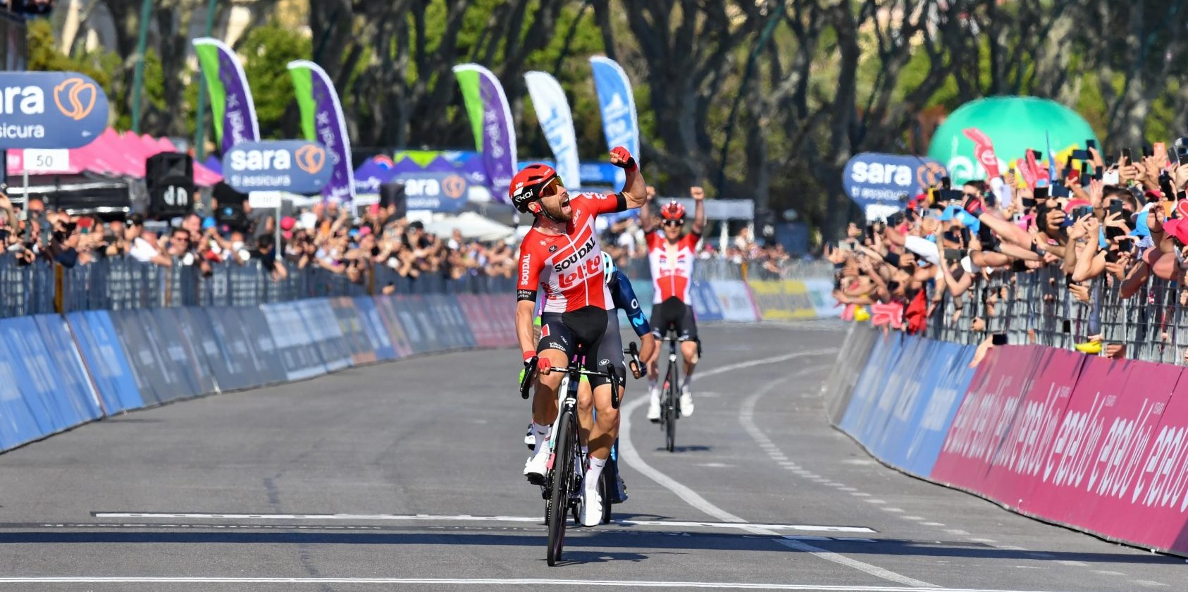 Mads Pedersen won in 2023 in Napoli. Hij voltooide hiermee de triologie door in elke grote ronde tenminste één etappe te winnen – foto: Cor Vos