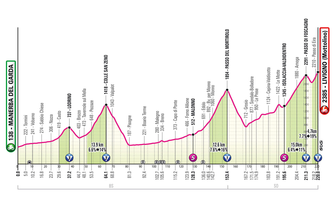 In de finale van de etappe liggen de zwaarste beklimmingen met de iconische Passo del Mortirolo (12,6 km aan 7,6%), Passo di Foscagno (15 km aan 6,4%) en de finish ligt in Livigno bij skigebied Mottolino (4,7 km aan 7,7%). De toppen van deze laatste twee beklimmingen liggen boven de 2.000 meter. Een dag voor de beste klimmers dus!