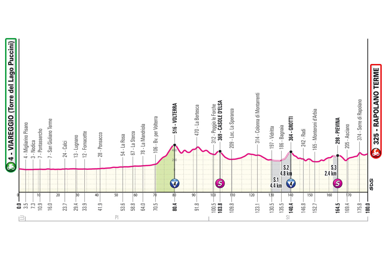 De etappe van woensdag 8 mei trekt wederom langs de Tyrreense kust. De 179 kilometer lange rit kent twee beklimmingen, twee tussensprints en lijkt op het lijf geschreven voor de aanwezige sprinters. De 1.700 hoogtemeters die het parcours telt, mogen immers geen probleem zijn voor de snelle mannen.