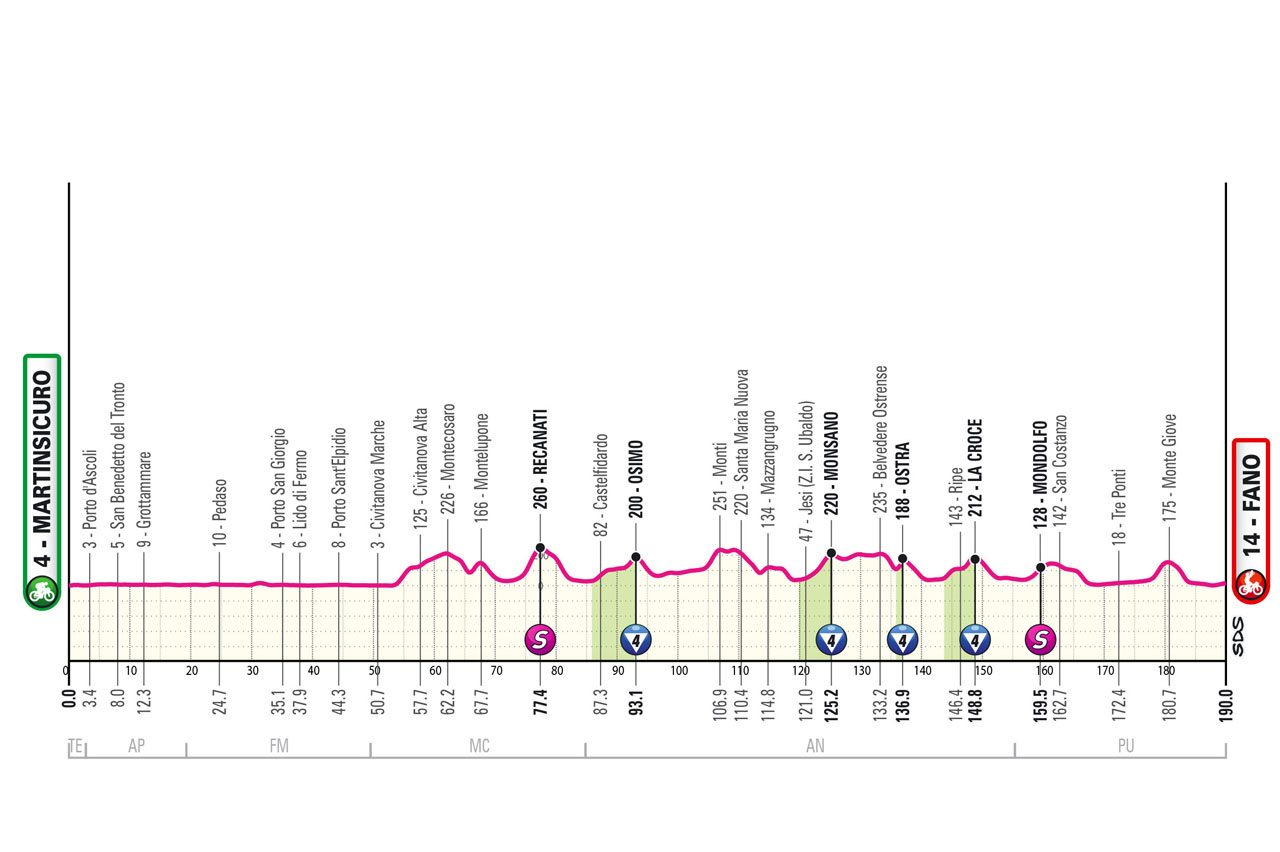 De vierde etappe van de Ronde van Italië is geen vlakke, maar biedt wel kansen voor de sprinters. Gedurende 190 kilometer worden er 2.079 hoogtemeters overlegd, maar verreweg de meeste van deze stijgende meters zijn in het eerste gedeelte van de rit te vinden. Na de Colle del Melogno (8,9 km aan 4,3%) is het merendeel van de stijgende kilometers verreden.
