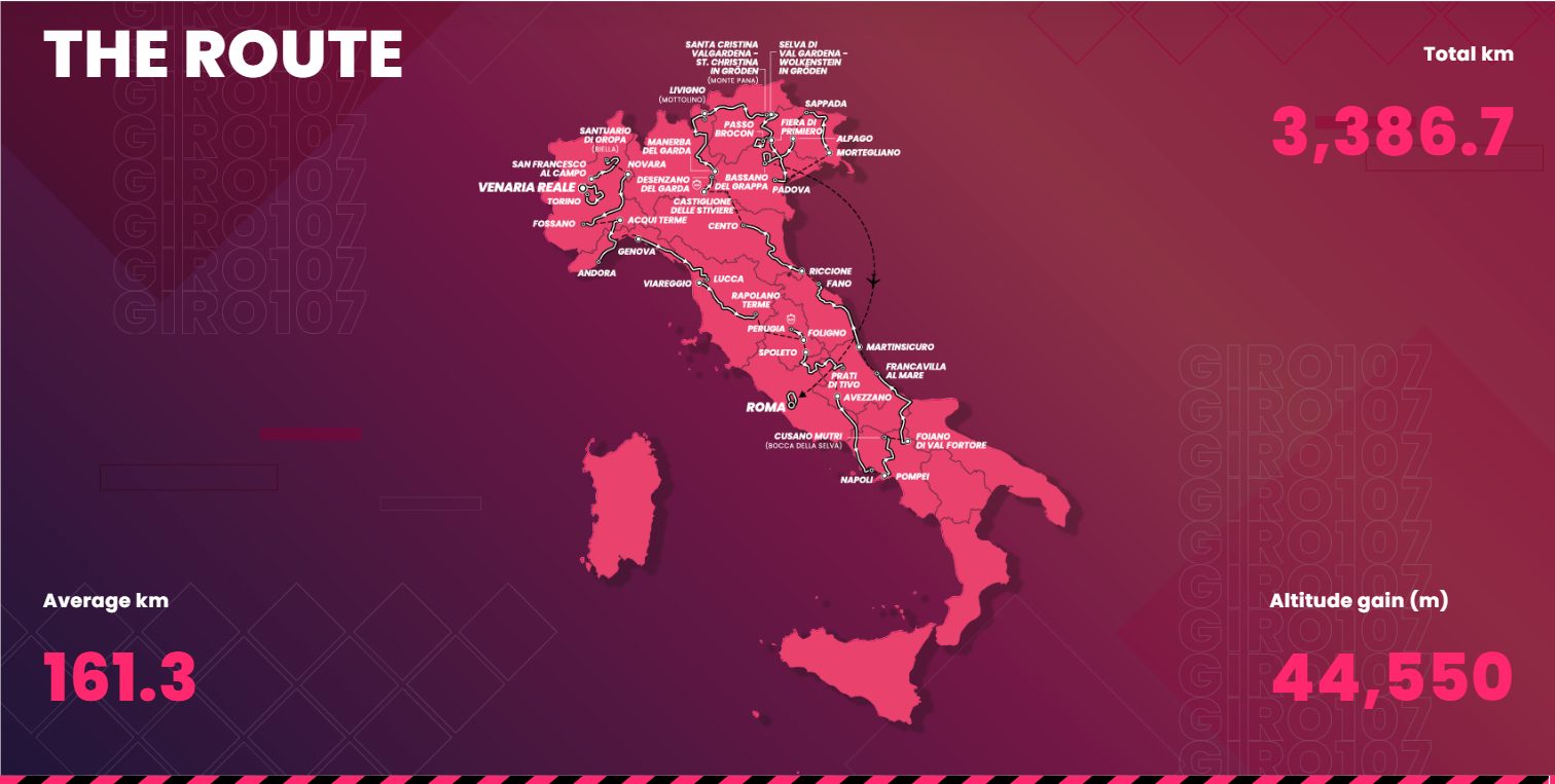 De drieweekse wedstrijd kent haar Grande Partenza dit jaar in Venaria Reale, een aanliggende gemeente van de Noord-Italiaanse stad Turijn. De kans dat we dit jaar een sprinter in de roze trui zien, lijkt klein. De eerste rit is namelijk op het lijf geschreven van puncheurs en op dag twee wordt er al voor het eerst bergop gefinisht. Vanuit de regio Turijn vertrekt de Giro-karavaan in de eerste week, via de Tyrreense kust, richting Zuid-Italië. Zuidelijker dan de start van de tiende etappe, in het historische Pompei, komen de renners dit jaar niet. De voet en hak van de Italiaanse laars worden dit jaar niet bezocht.