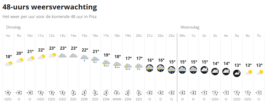 ’s Ochtends is het nog droog in Lucca en Pisa, maar vanaf 15.00 uur kan er een spatje regen vallen. De eerste renners zullen dan al binnen zijn. Alexander Krieger (Tudor) start om 13.20 uur namelijk als eerste renner. Ook dagfavorieten als Edoardo Affini (start om 13.55 uur) en Daan Hoole (14.02 uur) zullen het waarschijnlijk wel droog houden, maar voor Wout van Aert (14.34 uur) en Joshua Tarling (14.36 uur) wordt het al iets krapper, al lijken zeiknatte wegen hen nog bespaard te blijven.