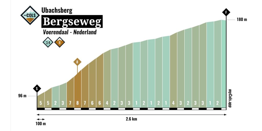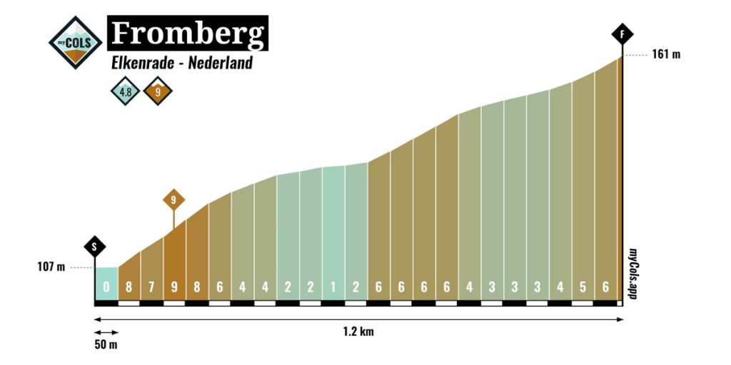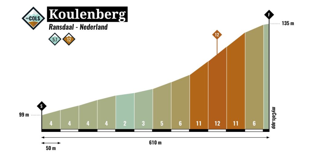 Enkele van de uitdagende beklimmingen onderweg onder andere de Fromberg en de Bergseweg. Ook moeten de renners onderweg tien keer de Koulenbergsweg (bergsprint) en Kerkveldweg (finish) bedwingen. Geen geweldig zware beklimmingen maar met een totaal van 39 klimmetjes zal het een ware uitputtingsslag worden.